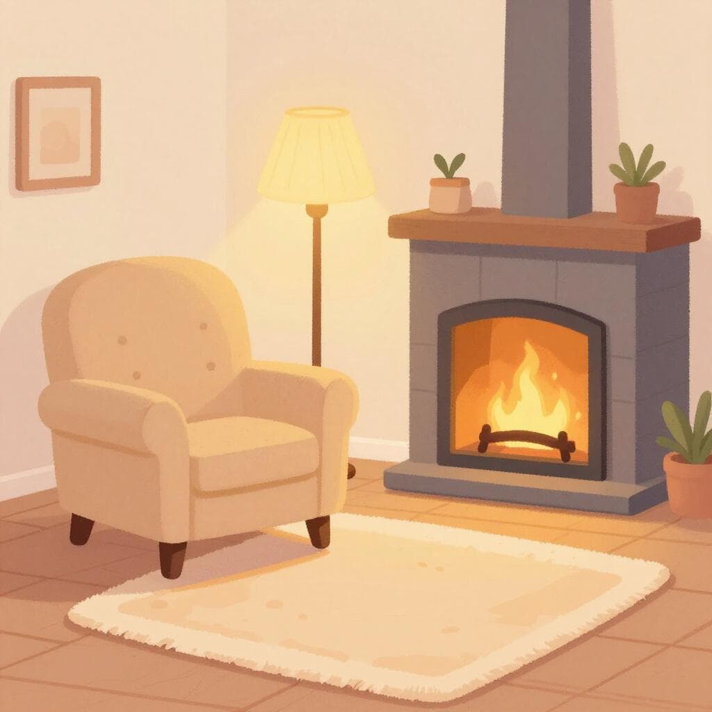 Un soggiorno caldo e confortevole con una morbida poltrona, un camino acceso e un tappeto soffice.