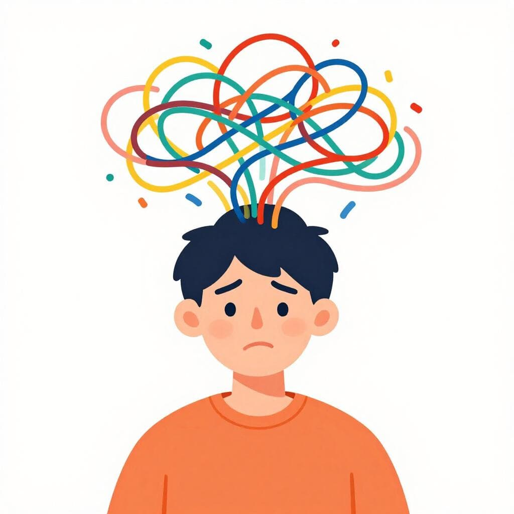 頭の上に渦巻く雲があり、困惑した表情をしているキャラクター。