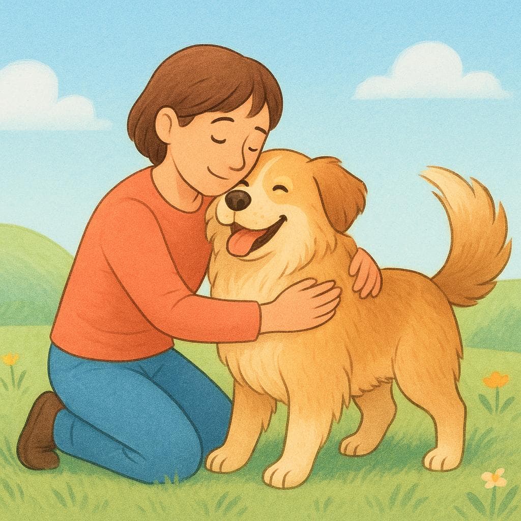 Uma pessoa abraçando calorosamente um cachorro amigável e fofo em um prado ensolarado, mostrando profundo afeto.