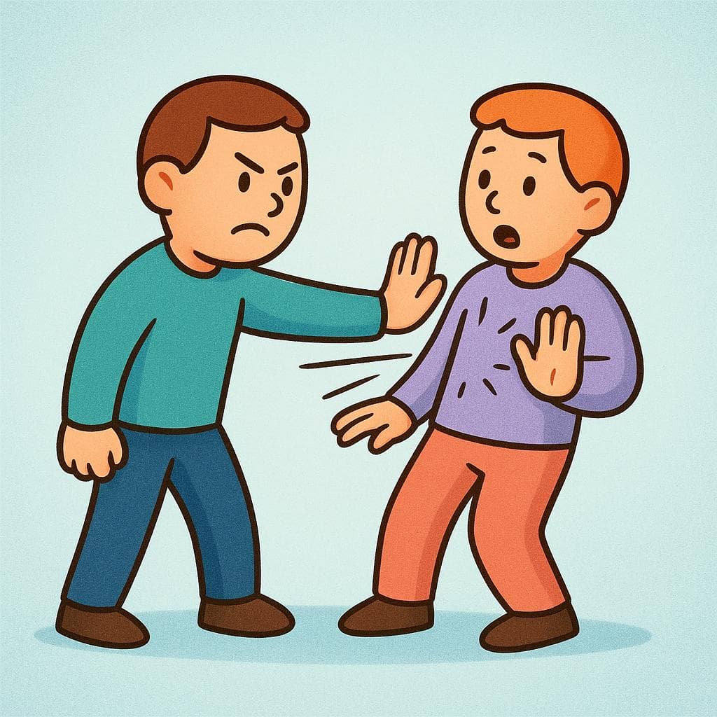 A simple colorful storybook illustration showing one person aggressively pushing another person with both hands. Both figures have angry expressions.