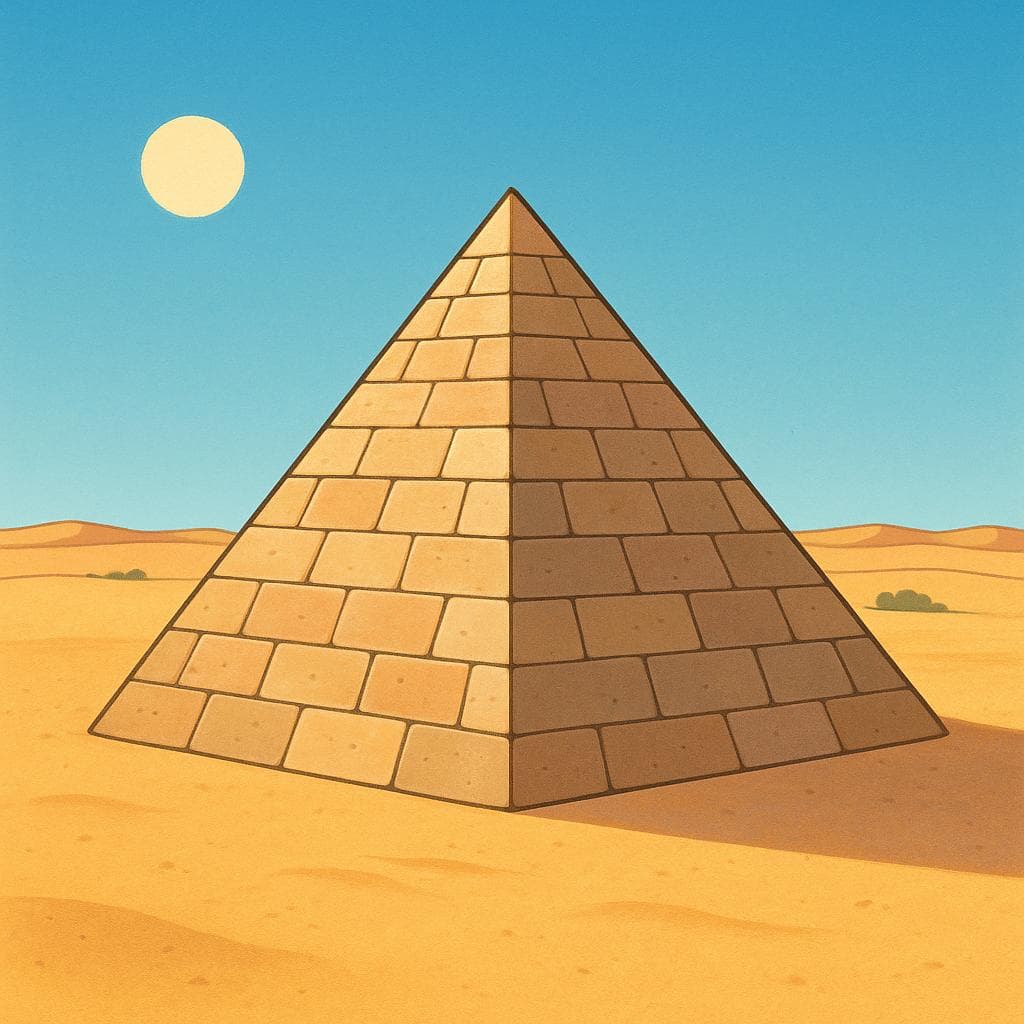 A simple illustration of a large, stylized stone pyramid standing alone in a bright, sunny desert landscape, representing a specific historical society.