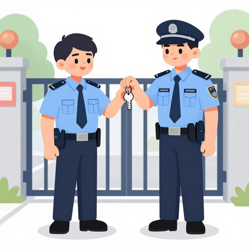 B2The soldier relieved his comrade at the base gate.
