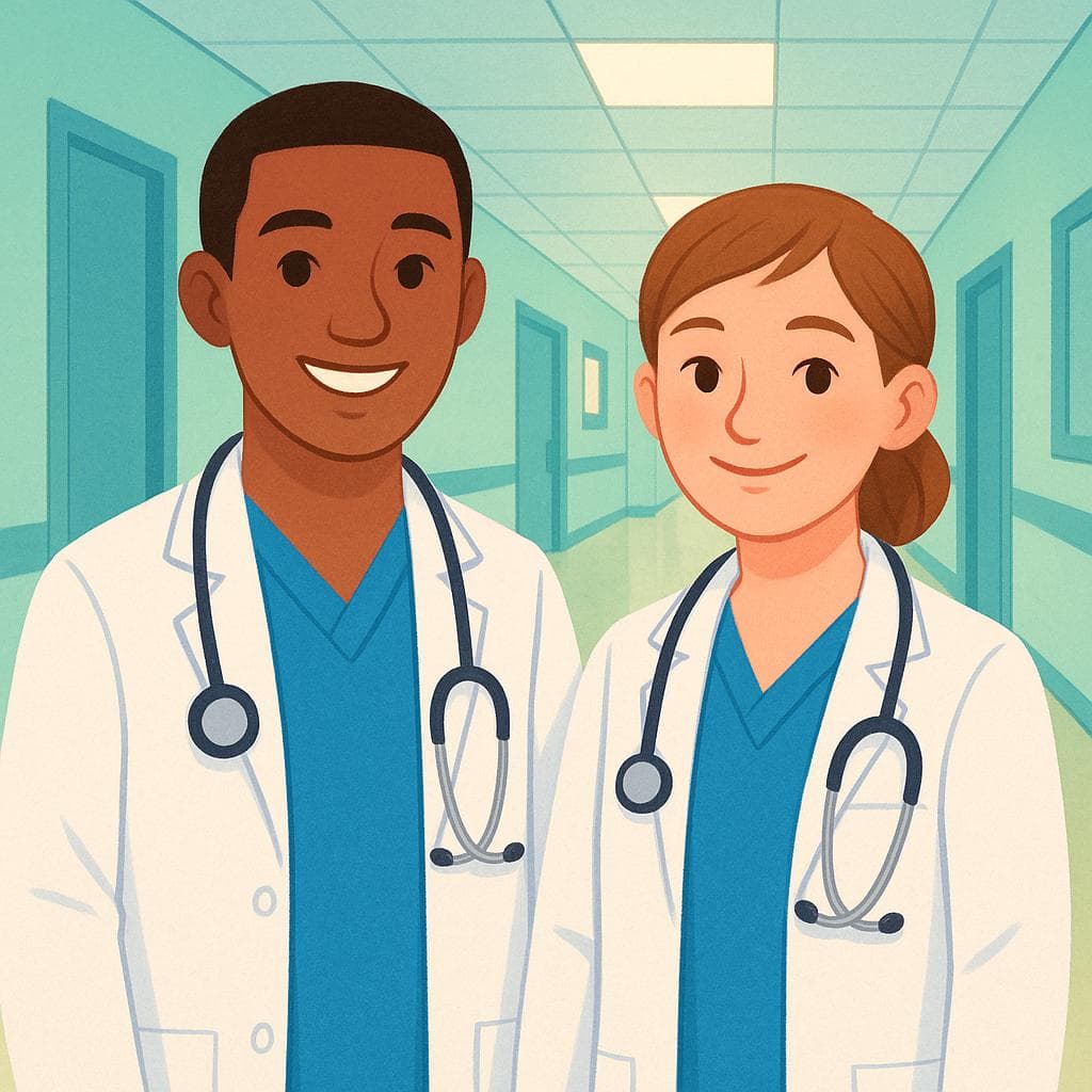 Los médicos residentes trabajan muchas horas en este hospital.