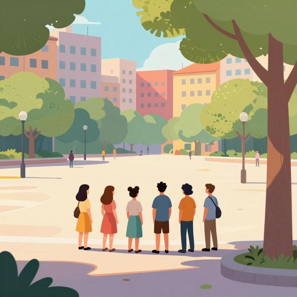 Un piccolo gruppo di persone in piedi nell'ombra ai margini di una piazza cittadina luminosa e vivace.