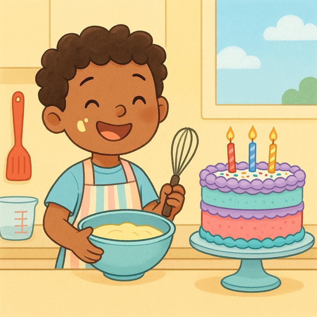 シェフの帽子とエプロンを身に着けた陽気な子供が、大きな泡立て器を持ち、キッチンカウンターに置かれた焼きたての明るいデコレーションケーキを誇らしげに見つめている。