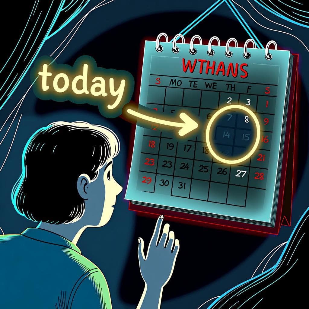 カレンダーを見ている人が、今日から未来のイベントに光る矢印が指している。