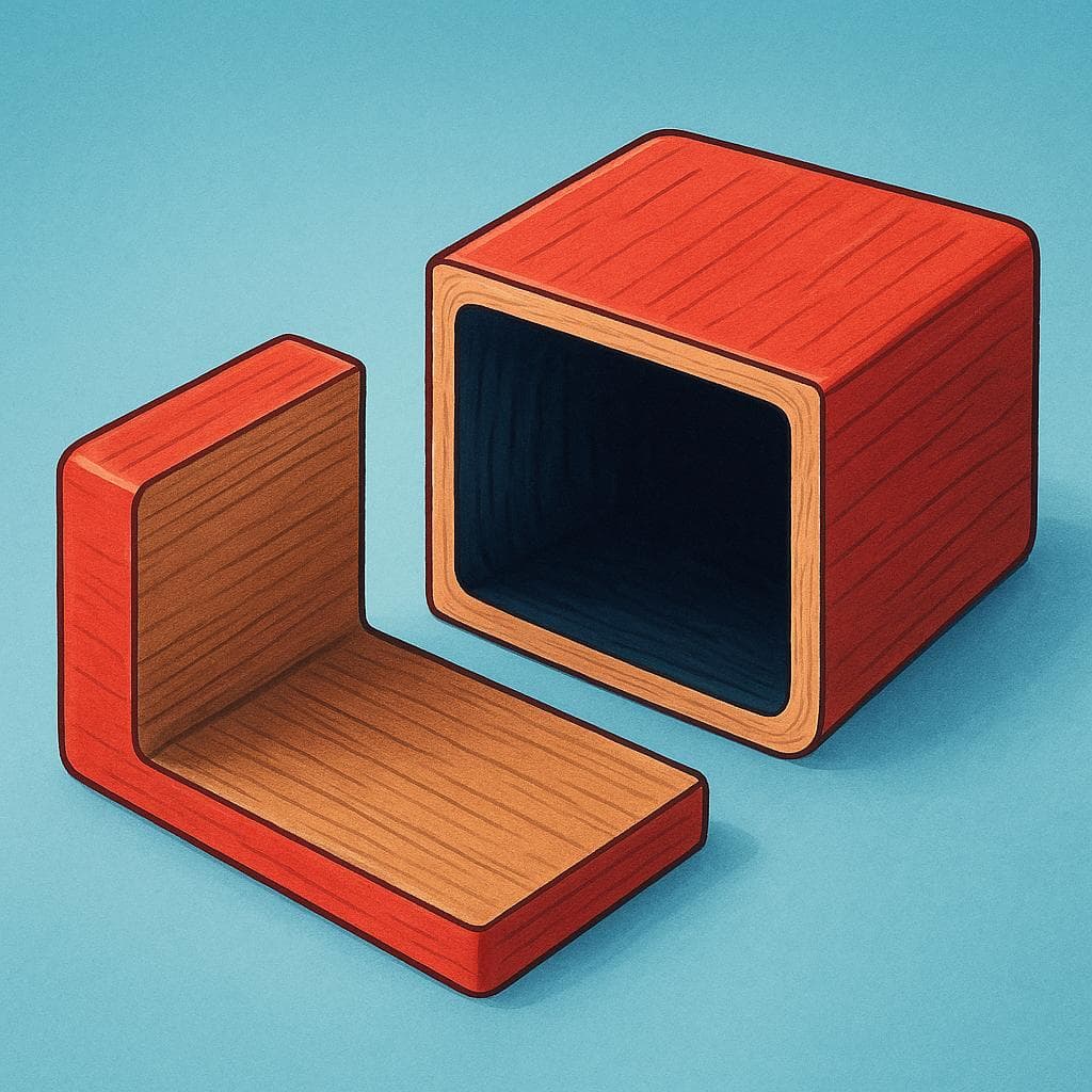 開いた赤い木箱が、深く暗く空っぽの内部空間を見せるように切断されており、「内部」の概念を強調している。
