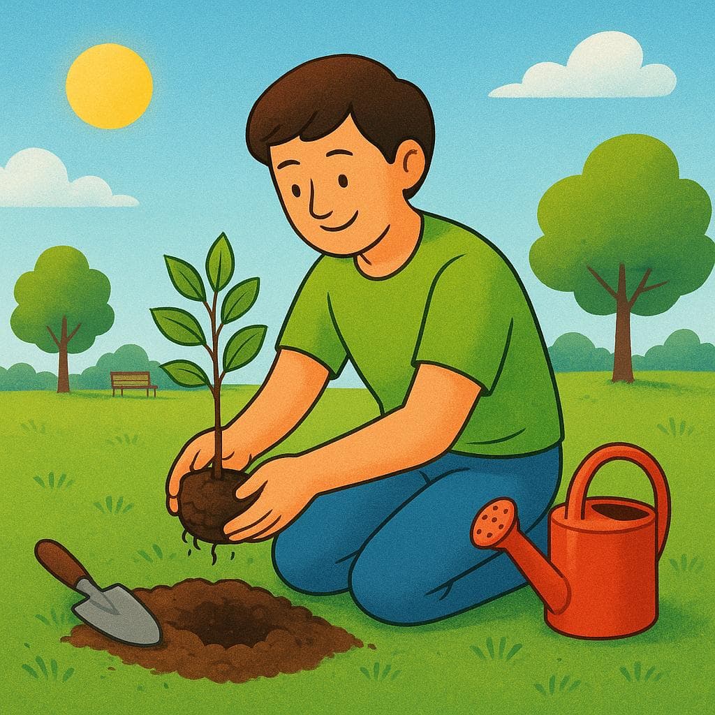 笑顔の人が手袋をして緑の公園にひざまずき、小さな木の苗を地面に植えている。