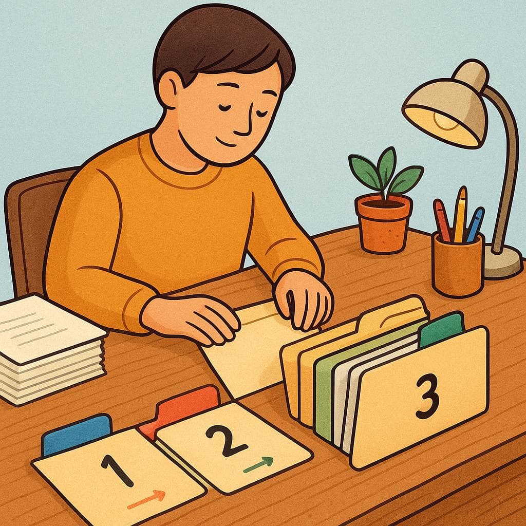 ラベルの付いたフォルダにファイルを整理しながら、整然とした構造化された木製の机で熱心に作業する人。
